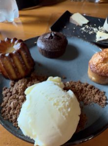 Cannelé, financier, fondant de chocolate, helado artesanal (plato con postres varios) acompañado del vino chateau peyrou 2018.